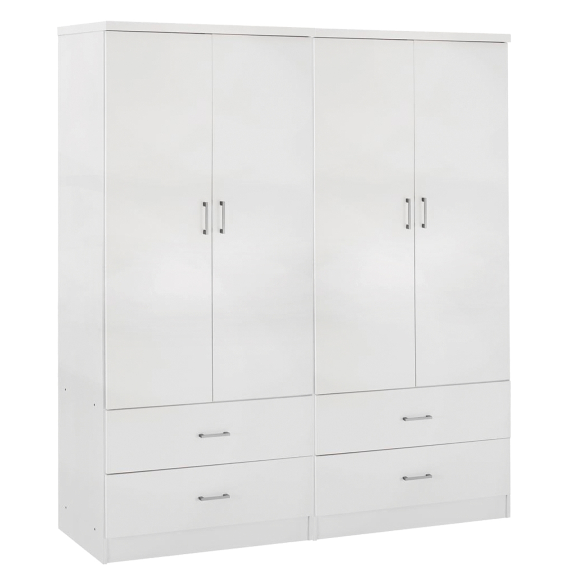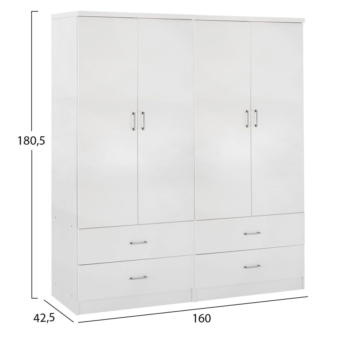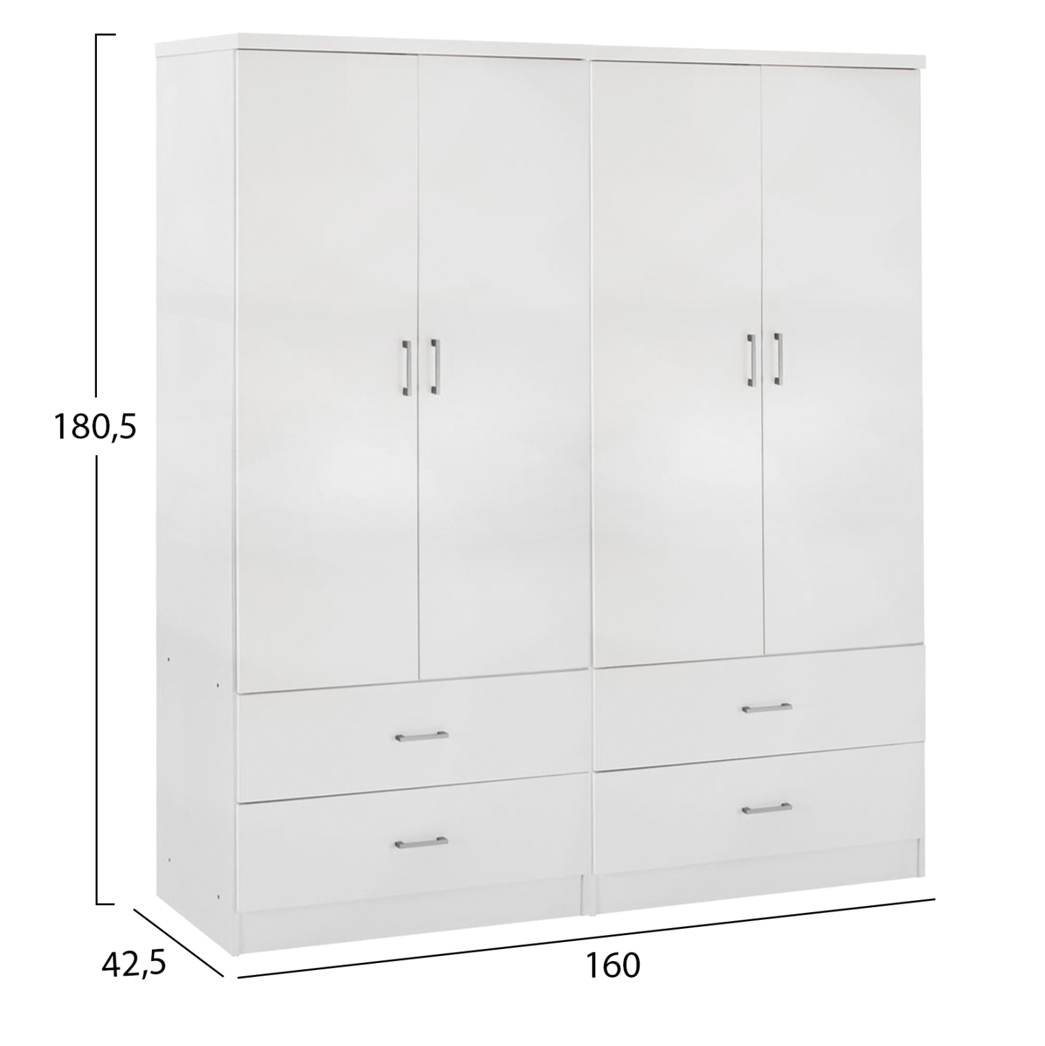Γνωρίστε την 4-φυλλη ντουλάπα-γκαρνταρόμπα REINA. Πρόκειται για μια μεγάλη ντουλάπα με 4 πόρτες, και στο εσωτερικό της υπάρχει μόνο μια INOX μπάρα για κρέμαση ρούχων. Κάτω ακριβώς από τον χώρο της γκαρνταρόμπας υπάρχουν και 4 ευρύχωρα συρτάρια. Οι πόρτες αλλά και τα συρτάρια ανοίγουν με καλαίσθητα ασημί χερούλια. Είναι κατασκευασμένη από μελαμίνη σε ΛΕΥΚΟ χρώμα και αισθητικά μπορεί να ταιριάξει με πολλά άλλα στυλ, χάρη και στις «καθαρές» γραμμές της.