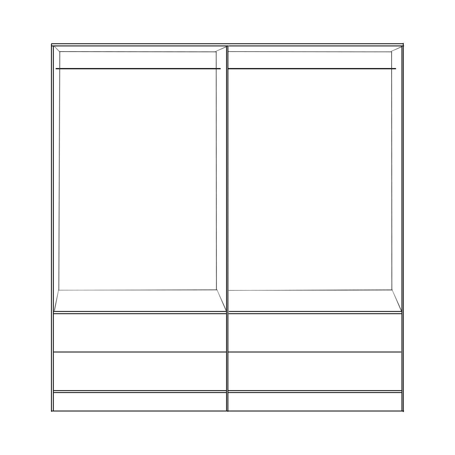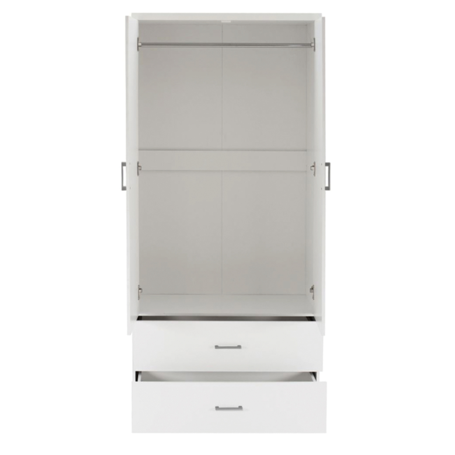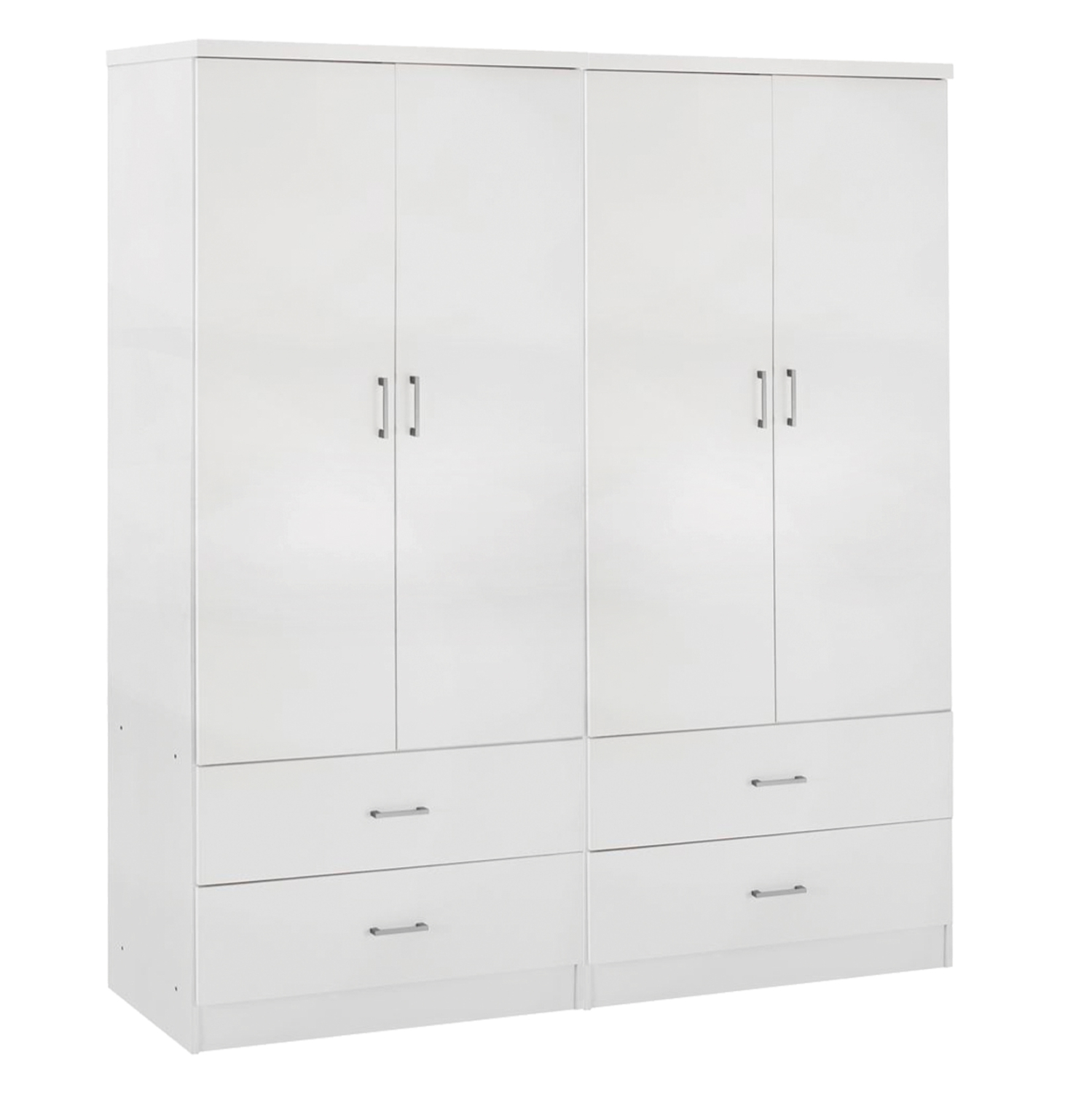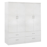 Γνωρίστε την 4-φυλλη ντουλάπα-γκαρνταρόμπα REINA. Πρόκειται για μια μεγάλη ντουλάπα με 4 πόρτες, και στο εσωτερικό της υπάρχει μόνο μια INOX μπάρα για κρέμαση ρούχων. Κάτω ακριβώς από τον χώρο της γκαρνταρόμπας υπάρχουν και 4 ευρύχωρα συρτάρια. Οι πόρτες αλλά και τα συρτάρια ανοίγουν με καλαίσθητα ασημί χερούλια. Είναι κατασκευασμένη από μελαμίνη σε ΛΕΥΚΟ χρώμα και αισθητικά μπορεί να ταιριάξει με πολλά άλλα στυλ, χάρη και στις «καθαρές» γραμμές της.