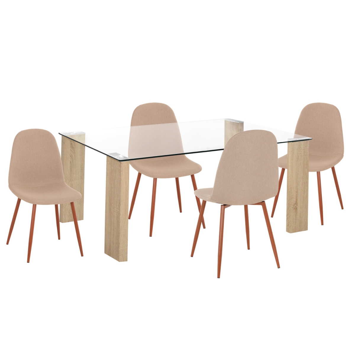 Ένα ορθογώνιο τραπέζι με πόδια από MDF σε SONAMA χρώμα και γυάλινη επιφάνεια, και 4 καρέκλες με πόδια μεταλλικά σε καφετί χρώμα και κάθισμα με επένδυση από ΜΠΕΖ ύφασμα.