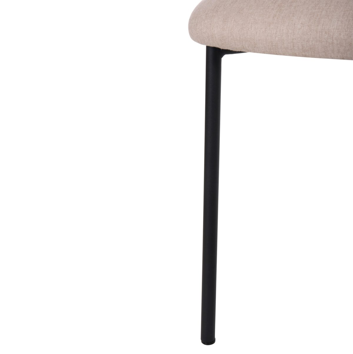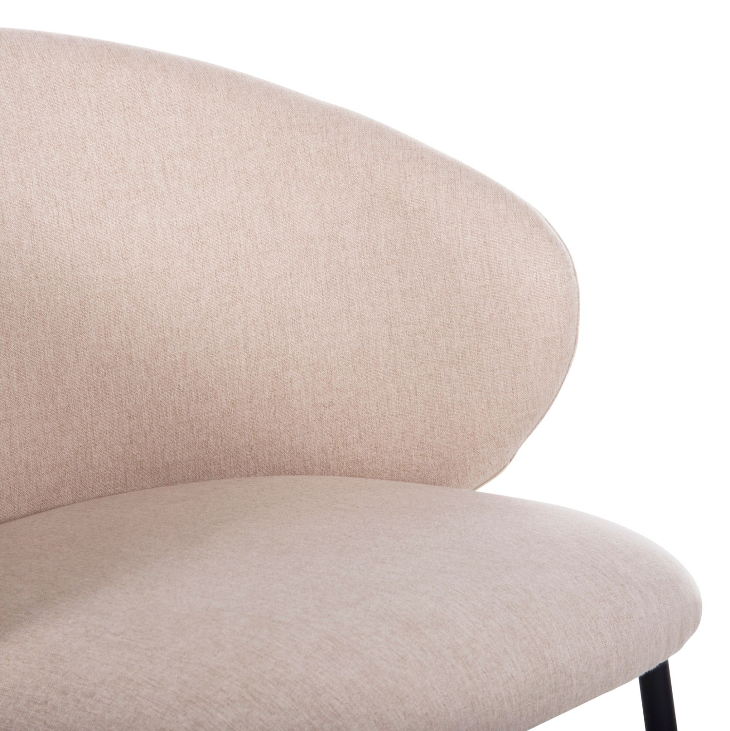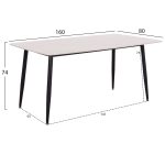 Ένα ορθογώνιο τραπέζι με σκελετό μεταλλικό σε ΜΑΥΡΟ χρώμα και κεραμική επιφάνεια με όψη ΛΕΥΚΟΥ ΜΑΡΜΑΡΟΥ, και 4 καρέκλες με ημικυκλική πλάτη και κάθισμα με επένδυση από ύφασμα σε ΜΠΕΖ χρώμα και μεταλλικά πόδια σε ΜΑΥΡΟ χρώμα.